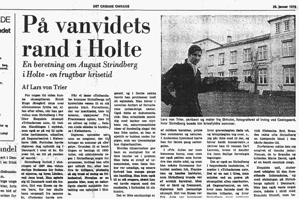 As a child, von Trier acted in a children's TV series, while he made his first public statement as an adult in 1976, at 19, with an article in a local newspaper [2]. The photo shows a young man who is already consciously constructing his artistic persona. The article is about Strindberg and his madness, and Edvard Munch, the painter, and his madness. Von Trier liked the idea of mad, suffering artists. The self-portrait of the artist as a young man, with a vampire-like drop of blood and Calvary in the background, shows how he saw, or imagined, himself [3], contrary to the nice young man in the photo taken from around the same time (c. 1975) [4].