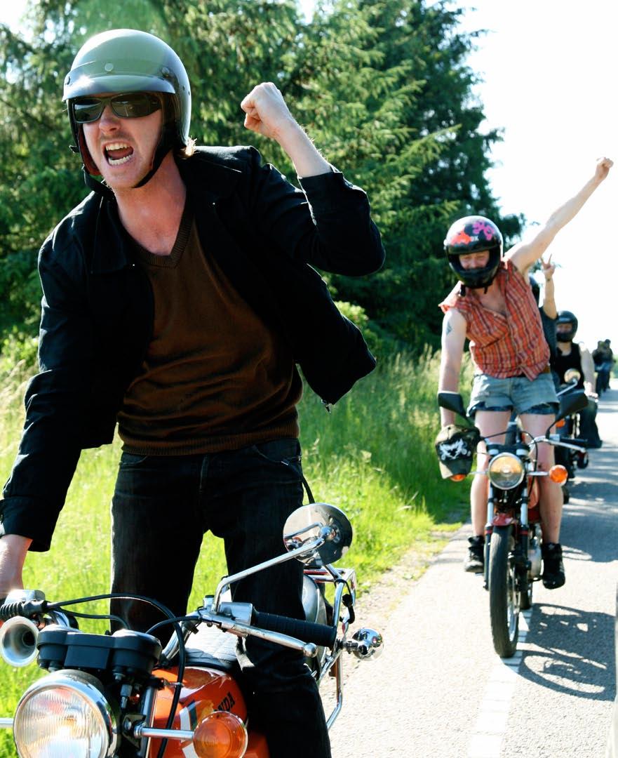 Known as The Wild Hearts (De Vilde Hjerter), the gang and its interactions are heavily about bonding through transgression. Meanwhile, as the kitschy nickname implies, a good-sized helping of irony is involved. The members are all in their early or mid-twenties and the whole idea of moped-riding is evidently inspired by their parents’ generation that rode mopeds in the 1970s. The gang’s universe is riddled with mythology, symbols and ritual, balancing – typically, perhaps, for their generation – between hi-jinx and sincerity, detachment and passion. All the while, gravity lurks just behind the goofball facade.