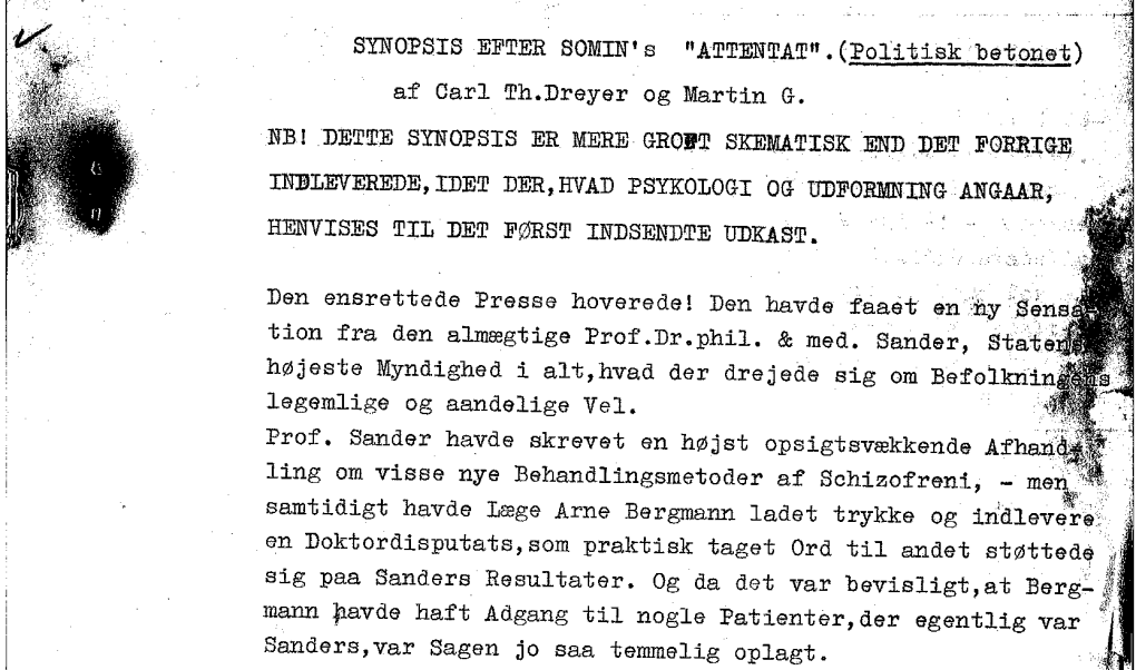 Her er det oplagt at inddrage en hidtil ukendt, udateret 12-siders synopsis, som Dreyer og medforfatteren Martin Glanner udarbejdede tidligt i forløbet.13 Den har titlen Attentat (Politisk betonet)14 og kombinerer den videnskabelige konflikt med en politisk. Dreyer har allerede i denne fase skiftet miljøet ud, idet han tidligt foretrak akademikerkredse frem for et arbejdermiljø. Men det politiske spor indflettes lige fra første linje, hvor det hedder: ”Den ensrettede presse hoverede!” (s.1). I denne version af historien befinder vi os nemlig i en ikke nærmere defineret diktaturstat15, hvor Arne Bergmann16 ”gennem flere Aar havde været mistænkt (…) for visse uheldige Sympatier med Frihedstankerne i et Land, man stod paa en meget daarlig Fod med – og yderligere mistænkt (…) for at være et aktivt Medlem af visse underjordiske Bevægelser, der var Regeringen yderst uvelkomne” (s.1). I denne synopsis fremstår Arne som en endnu mere aktiv politisk aktør end hos Somin, idet han ligefrem er den, der – som han siger – har vundet ”de Unge for Frihedsidealerne, det er mine Skrifter, de i al Hemmelighed sluger” (s.7, Dreyers understregning). Hans engagement i samfundet uddybes: