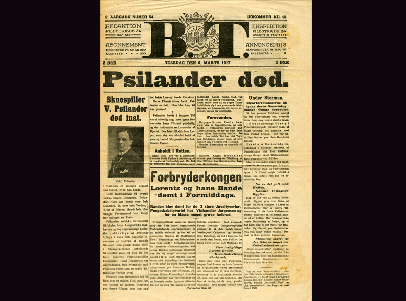 Unavngiven (1917) ”Skuespiller V. Psilander død i nat.” I: B.T. 06.03.1917.