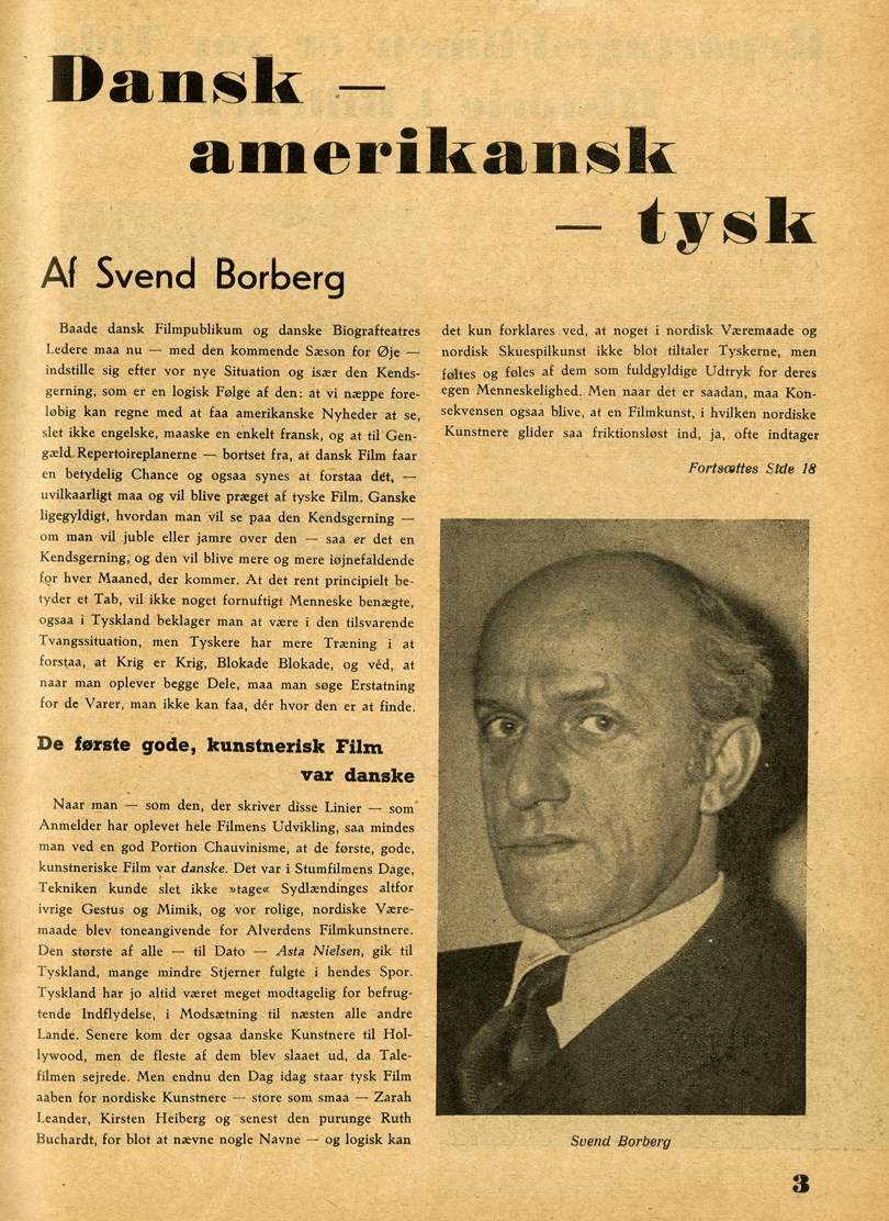 Forsiden prydes af et billede af Zarah Leander, og på næste side, hvor FILM vanen tro bringer korte læserindlæg, handler samtlige spørgsmål om tyske filmstjerner. Denne pludselige læserinteresse for Willy Fritsch, Victor Staal m.fl. har ikke vist sig i et eneste af de forudgående blade, hvor der kun yderst sjældent er blevet spurgt til tysk film og tyske filmstjerner. Læsernes hang til det tyske har heller ikke sat sig spor i den serie af dybtryksbilleder af filmstjerner, som FILM ellers har reklameret vedholdende for i det forløbne lille års tid. Ikke én tysk filmstjerneplakat er blevet tilbudt læserne. Og redaktionens udvalg af ’idol-plakater’ må vel udspringe af en vurdering af, hvilke stjerner læserne finder attråværdige nok til at hænge op derhjemme, eller sætte i den særlige samlemappe, FILM også er leveringsdygtig i. Så hvorfra kommer denne pludselige interesse? Et gæt kunne være, at redaktionen selv har skrevet de mange læserforespørgsler om tysk film specielt til dette specielle nummer. Men det er et gæt. Sikkert er det til gengæld, at åbningsartiklen på side tre er forfattet af kritikeren og dramatikeren Svend Borberg. Han var en af Nazitysklands fremmeste intellektuelle kulturelle fanebærere i det besatte Danmark, hvilket hans artikel heller ikke levner nogen tvivl om. I sine breve hjem til Berlin beskrev von Hake Borberg som et bud på en dansk kulturminister efter en nazistisk magtovertagelse i Danmark (Sørensen 2014: 118). Og Borberg begrænser sig ikke til at anmelde film, hans ærinde er også at fremhæve lighederne mellem Tyskland og den dansk-nordiske folkesjæl og det nordiskes appel til tyskerne med afsæt i danske og nordiske kunstneres succes i Tyskland før og nu: