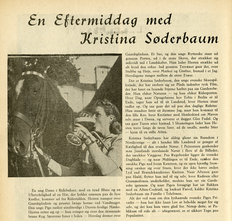 Sporerne lyner i Solen – Hovslag drøner over Gaardspladsen. Et Sus, og den unge Rytterske staar ud gennem Porten, ud i de store Skove, der strækker sig milevidt ind i Landskabet…Det er Kristina Söderbaum, den unge svenske Skuespillerinde, der har erobret sig en Plads indenfor tysk Film…Hun elsker Naturen – og hun elsker Ridesporten. Hver dag, naar Optagelserne hos Tobis i Berlin er til Ende, tager hun ud til sit Landsted, hvor Hesten staar sadlet op. Og saa gaar det ud paa den daglige Ridetur. Hun standser først sit ilsomme Jag, naar hun kommer til en lille Kro, hvor Krofatter med Skødeskind om Maven selv staar i Døren, og serverer et dugget Glas Fadøl. Og saa gaar turen atter hjemad. I Skumringen lader hun Hesten trave langs de tavse Søer, ad de smalle, mørke Stier – hjem til en stille Aften.