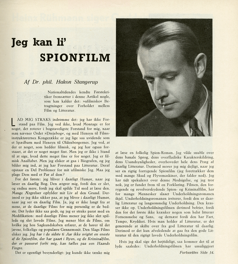 Men det er ikke den eneste ’lysebrune skønhedsplet’ på det første nummer, Mogens Brandt er medredaktør af. For nummerets åbningsartikel er skrevet af Nationaltidendes litteraturkritiker Hakon Stangerup. Han figurerer blandt dem, der senere kom under beskydning for at være tyskvenlige [3]. Særligt en artikel i tidsskriftet Nordisk Revue, hvor Stangerup under overskriften ’Kulturel Oprustning’ latterliggjorde enhver bekymring for Danmarks selvstændighed og kulturelle integritet under tysk overherredømme, medvirkede til at sværte hans navn. Det illegale blad, De frie Danske, trak ham gentagne gange gennem landsforrædernes søle, eksempelvis i 1943 (nr. 7, 2. årg., 1. udg., s. 6), hvor Stangerups artikel slås i hartkorn med ærkenazisten Harald Tandrups skriverier. Der tilfalder også Stangerup den tvivlsomme ære at blive udleveret som nøglefiguren Harald Horn i Hans Scherfigs Idealister, som blev udgivet i Sverige i 1944 og i Danmark lige efter befrielsen i 1945. I marts 1940, hvor Stangerup skriver i FILM – en ganske harmløs kærlighedserklæring til spionfilm – har han endnu ikke publiceret sin udskældte artikel i Nordisk Revue. Det sker først i august 1940. Men han har op gennem 30’erne hvæsset sin pen i Nationaltidende imod andres ”uforstående” kritik af det nye Tysklands kulturpolitik, han har angrebet danske forlæggere for at udgive anti-nazistiske bøger og agiteret for udgivelsen af ”betydelige nazistisk orienterede Digtere” i 1936 (Hertel 1998: 35). Noget helt ubeskrevet blad er det altså ikke, der lægger navn til en artikel i FILM i foråret 1940, og alene det, at Stangerup nu optræder i bladet, står i kontrast til den venstreorienterede gruppe af filmintellektuelle, der hidtil har præget FILM.