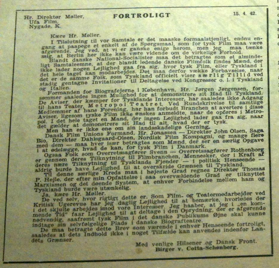 Den udveksling fandt sted i oktober 1940, måneden før FILM noget uventet udsender sit første og eneste temanummer – om tysk film. Og det rejser spørgsmålet, om Ufa forsøgte at købe FILM, når nu von Hake ikke kunne købe Biografbladet. Overfor von Hakes metoder stod Biografejerforeningen og Biografbladet langt stærkere rustet end et enmands-foretagende som FILM, der var et ugeblad, og derfor konstant skulle opdrive nyt stof at fylde i spalterne. Og at FILM lukker uden forvarsel, efter at have lanceret sin kampagne imod repriser og have bragt stadigt mere skingert pro-tysk stof, tyder på, at det er Brandstrup, der drejer nøglen. Måske efter pres fra personkredsen omkring Biografejerforeningen og Biografbladet, som jo gik til modangreb, da FILM faldt formanden for de københavnske biografejere, Jørgen S. Jørgensen, i ryggen og skaffede ham Fædrelandet på halsen. Det var i øvrigt kun første skridt i en længerevarende nazistisk kampagne imod Jørgensen. Han blev hængt ud af det om muligt endnu mere grovkornet nazistiske National-Socialisten i marts 1943 (23.3.1943) og angivet for tyskfjendtlighed af Ib Schønbergs nazistiske farbror, Birger von Cotta-Schønberg, der skrev nedenstående stikkerbrev til Ufa’s Anton Møller i april 1942.