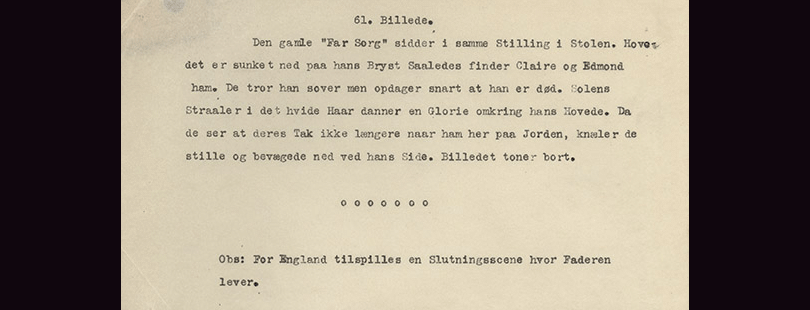 Paa Foranledning undlader jeg høfligst at erindre d’Herrer Instruktører om den engang vedtagne Regel, at hver Film med trist Slutning, – altid, selvom det maatte synes ganske misvisende, – forsynes med en forsonende Slutningsscene extra...