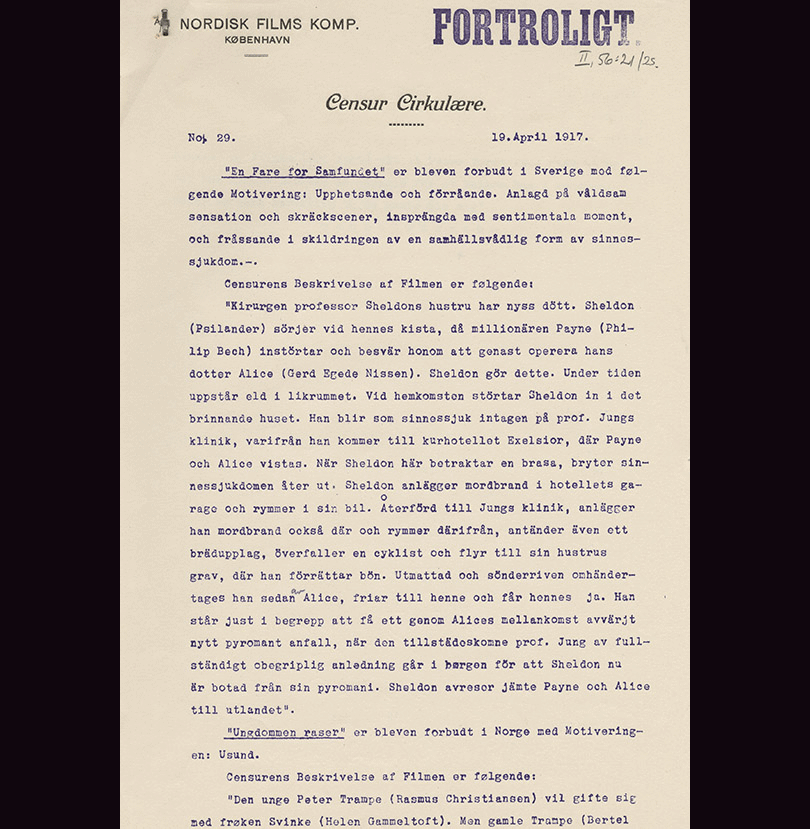 Allerede i 1908 var Olsen altså interesseret i at finde ud af, hvilke hensyn der skulle tages til censuren i den fremtidige filmproduktion [1]. Og Nordisks korrespondance vidner om, hvor vigtigt det var at tage hensyn til censuren for at opretholde eksporten til de forskellige markeder. Til en potentiel russisk forhandler af selskabets film skrev Olsen i 1907, at Nordisk fremstillede film, der gik igennem de enkelte landes censur, ”in unserer Fabrik wird nie etwas fabriziert, da nicht mit russischen Censur übereinstimmig ist” (NFS II, 6: 184). Olsen fremhæver her Nordisks evner til at tilpasse sig censuren, nærmest som et markedsføringsredskab. Censurspørgsmålet indgik også i planlægningen af filmproduktionen, som Nordisk skrev til en svensk aftager: