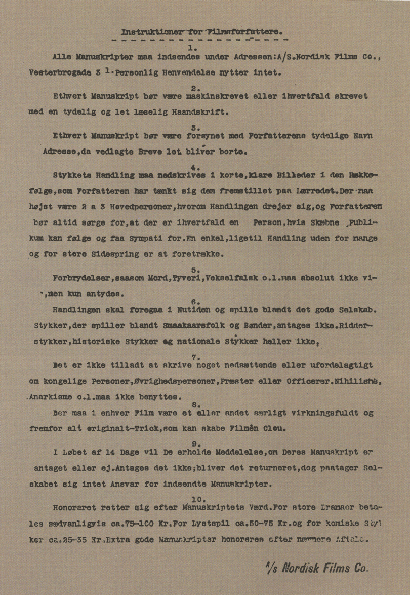 Rådene blev formaliseret i Nordisks officielle Instruktioner for Filmsforfattere, der blev skrevet omkring januar 1912, og senere samme år blev oversat til tysk (Schröder 2011: 327). Instruktionerne blev ofte vedlagt Nordisks afslag til manuskriptforfattere og bestod af ti punkter, som man skulle holde sig for øje, hvis man ville have et manuskript antaget hos selskabet. Nogle af punkterne har praktisk eller informativ karakter, som f.eks. at manuskriptet skal være maskinskrevet eller i det mindste skrevet med en tydelig og læselig håndskrift, hvor meget man kunne forvente at tjene på et manuskript, og at historien skal have mindst én person, publikum kan føle sympati med. Om indholdet i filmene kan man finde følgende retningslinjer: