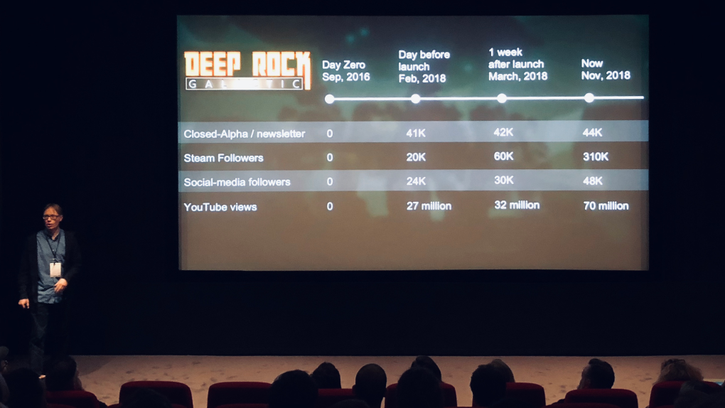 Det gav for eksempel Søren Lundgaard fra spilfirmaet Ghost Ship Games gode bud på med en gennemgang af hele lanceringen af deres første udgivelse, 'Deep Rock Galactic', der er støttet af Filminstituttets Spilordning og udkom i 'early access' på Steam tidligere på året. Fra første teaser i september 2016 til den endelige lancering i februar 2018 har holdet forsøgt at skabe opmærksomhed i stort set alle tilgængelige on- og offlinekanaler, og løbende prioriteret de mest effektfulde.