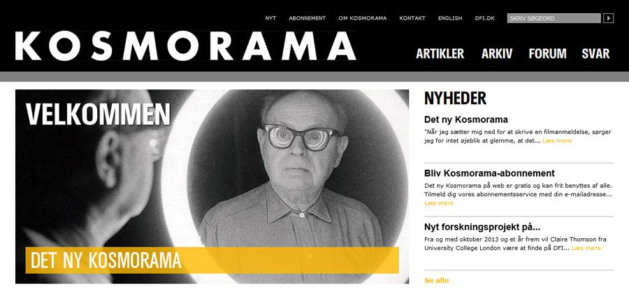 KOSMORAMA. Fra 1954 til 2012 udgav Det Danske Filminstitut filmtidsskriftet Kosmorama på tryk, senest i form af to årlige temanumre. Nu genopstår tidsskriftet digitalt med ny redaktør, nye artikler og mulighed for at søge og læse i det omfattende bagkatalog.