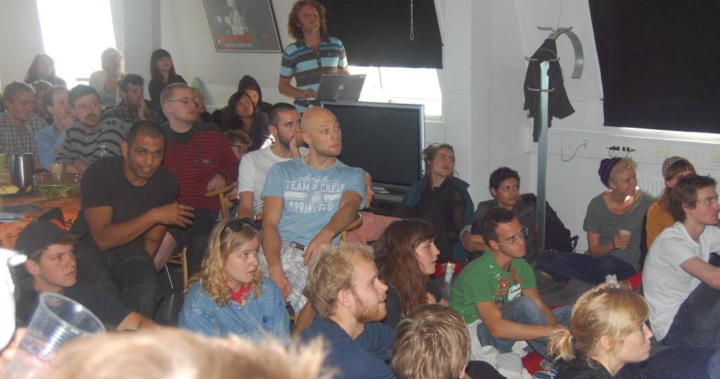 "Det er nemmere at tale sammen, når man har siddet stuvet sammen på gulvet", siger produktionsleder Maria Schou Andersen. Hun er glad for den store tilstrømning. "Der kunne ikke have været én mere i det her rum".