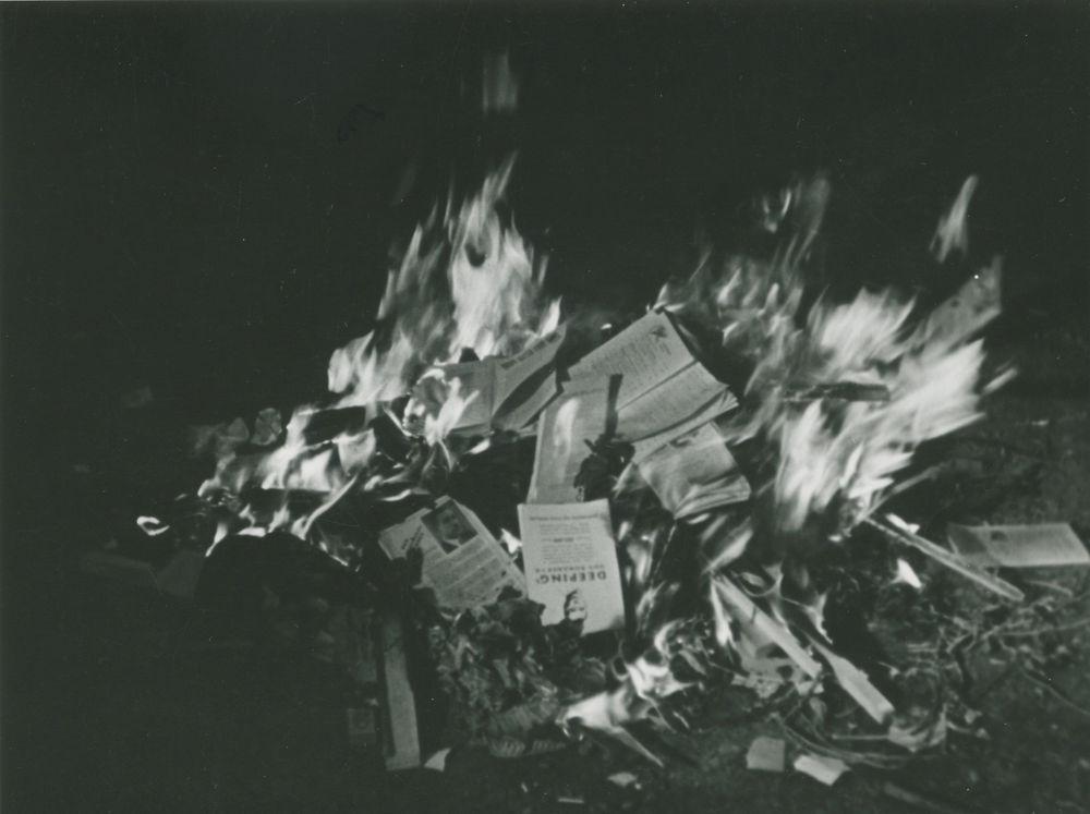 Still fra 'Danmark i Lænker' - afbrænding af bøger og illegale blade.