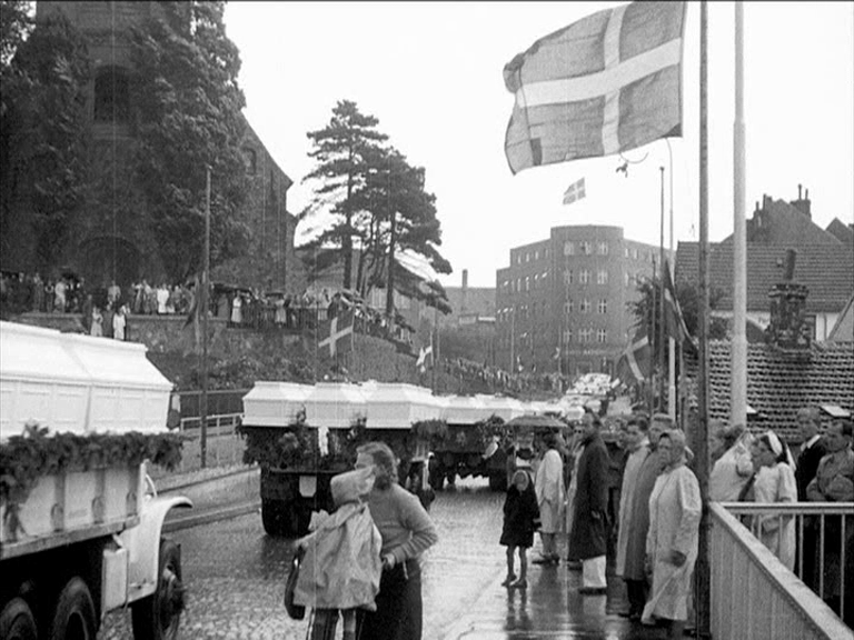 Der findes også imponerende og bevægende optagelser fra den store mindehøjtidelighed, som blev afholdt for de faldne den 29. august 1945. Blandt andet den enorme bilkortege med flagdækkede kister af krigens faldne, som heller ikke fandt plads i filmene. Det samme gælder optagelserne af det sørgetog med 115 kister med danskere, der døde i tysk fangenskab, som blev kørt i procession op gennem Danmark ’på et tæppe af blomster’, som skolebørn har kastet ud foran ’Danmarks største ligtog’, som speaken forkynder. Det kom der en ugerevy fra Dansk Film Co. ud af, 'Danske Patrioters Hjemførsel fra Tyskland', men ingen klip i de vigtigste film om besættelsen.
