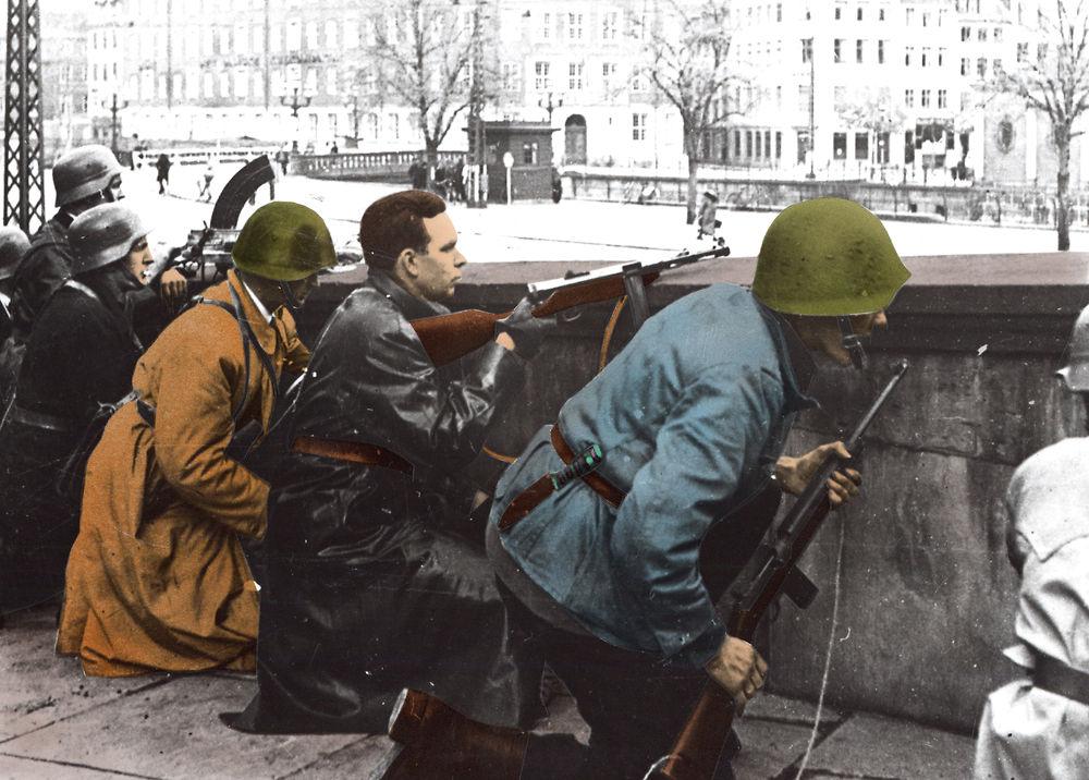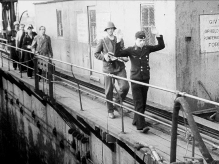 Frihedskæmpere besætter B&W – tydeligt iscenesatte sekvenser fra den 15. maj 1945.