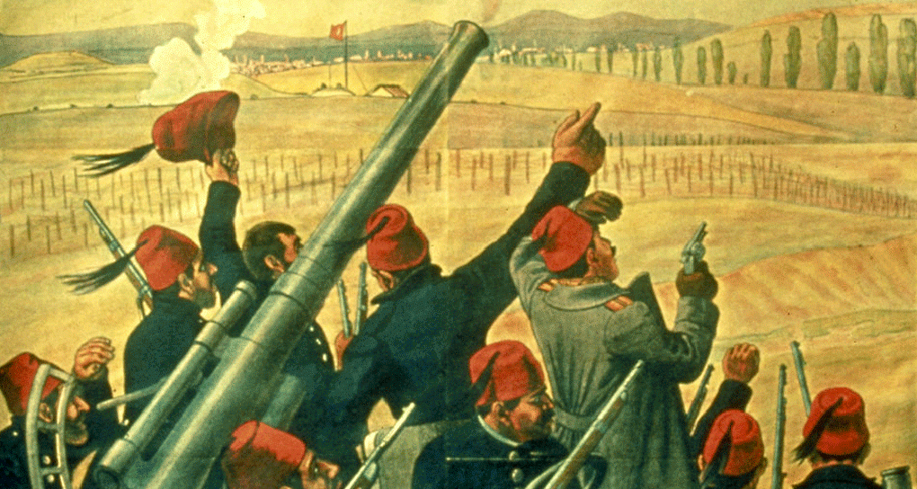 Dansk feltartilleri var i beredskab gennem hele krigen. Her ses de under en øvelse. Hvorvidt det danske militær var af den styrke, som forsøges formidlet og fejret i filmene, blev heldigvis aldrig afprøvet.