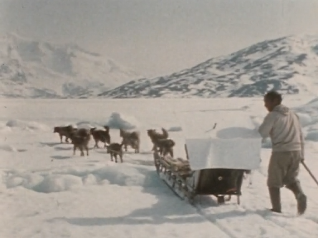 Jette Bangs optagelser fra en sælfangst i Grønland. En fanger kommer kørende med hundeslæde og stopper op ved et…