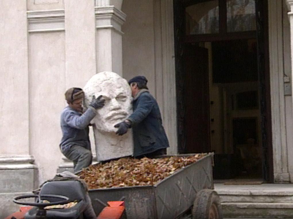 Østpolen, november 1990. To arbejdere kører en statue af Lenin gennem efterårslandskabet. De ankommer til et gammelt,…