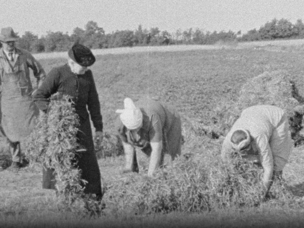 Tængning af tangtag, 1951. Kvinder bearbejder den løse tang ved at presse, vride og sno tangen sammen til 'vasker'. …
