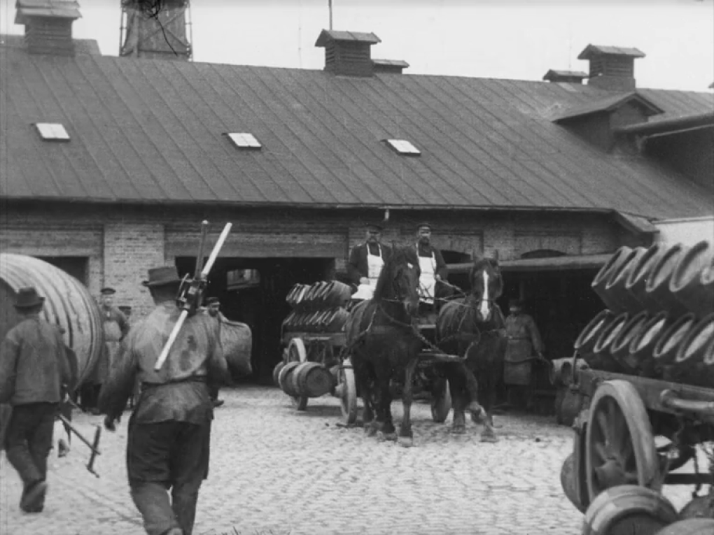 Hestevogne kører ud fra bryggeriet Ceres, lastet med ølfade og andre bryggeriprodukter.