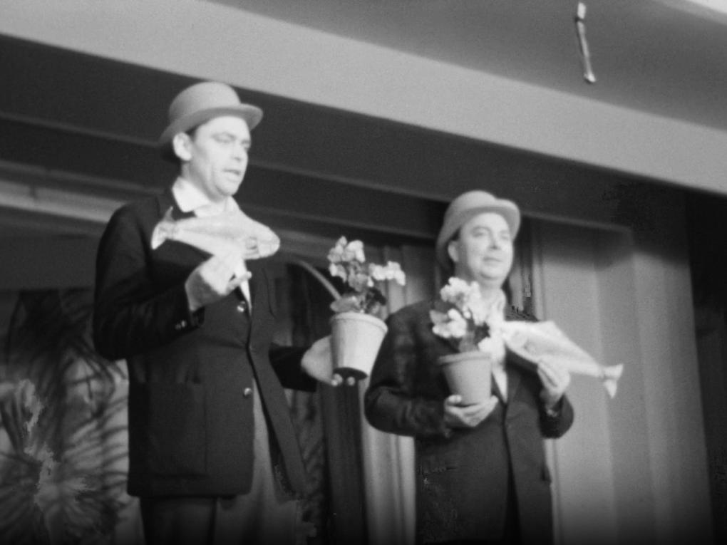 Optagelser fra prøverne på ABC-teatrets revy 'På slap line' med Ib Glindemann, Dirch Passer, Stig Lommer, Elga Olga,…