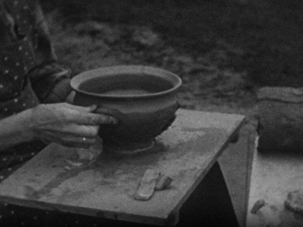 Potteleret hentes, blandes med sand og vand og æltes med fødderne, hvorpå det skæres op i stokke. Arbejdet formes…