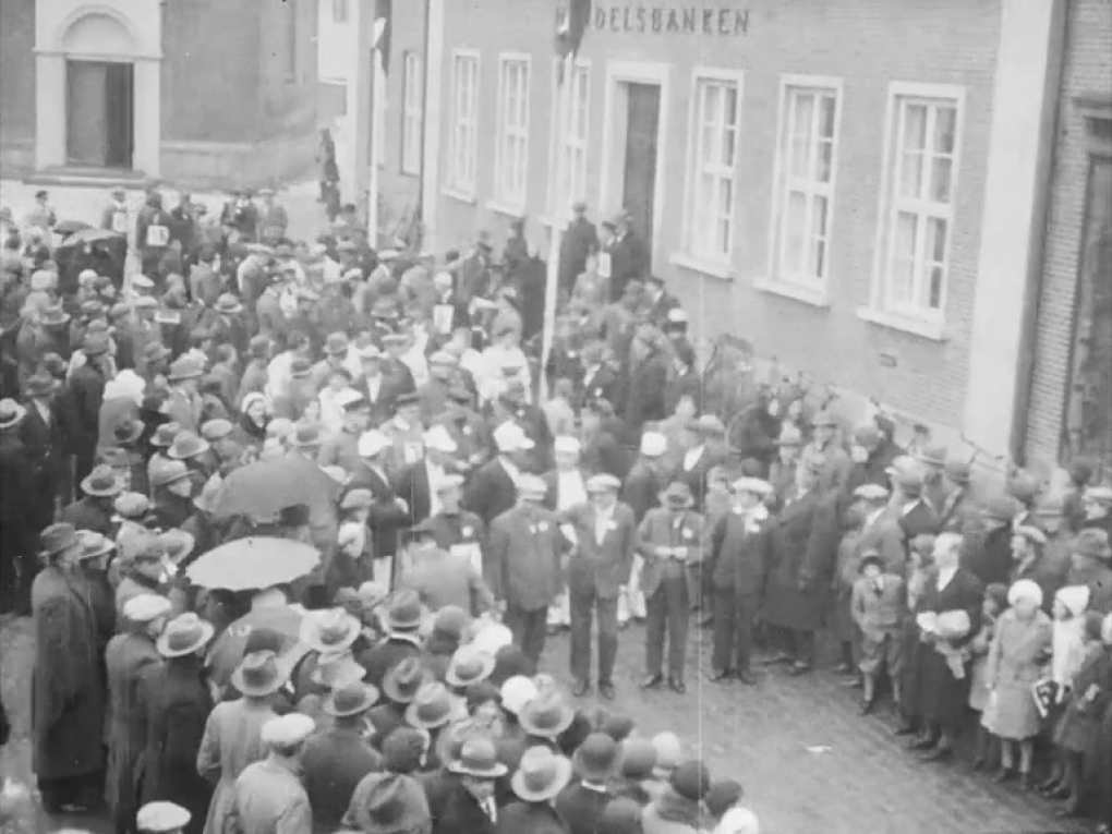 Børneidrætsstævne i Tønder afholdt 10. maj 1933 af foreningen Det unge Grænseværn. Optog med blomstersmykkede heste…