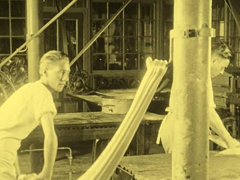 Detaljeret skildring af bolsjefremstilling på fabrik i Kolding. Vi ser, hvordan bolsjemassen "slynges" både ved hånd-…