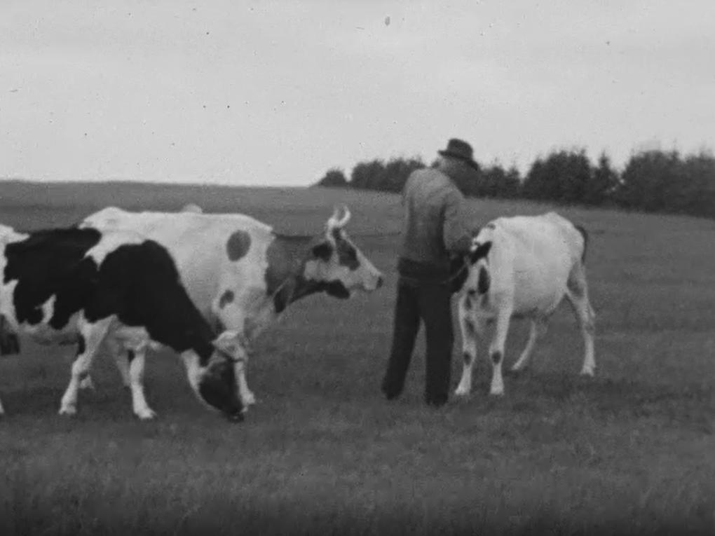 En gammel bonde trækker vand op ad brøden på en hedegård ved Karup. En landmand samler sine køer på marken for at…