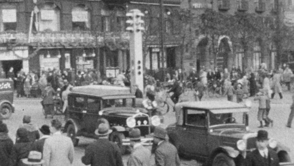 Broen går op og ned. Sporvogne, biler og trafikanter på broen.