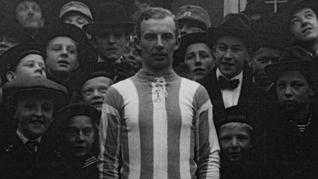 Kjøbenhavns Boldklub (KB) og Østerbros Boldklub (ØB) på KBs bane den 12. december 1915. Dommeren hedder Westergård. Poul 'Tist' Nielsen' brænder et mål.