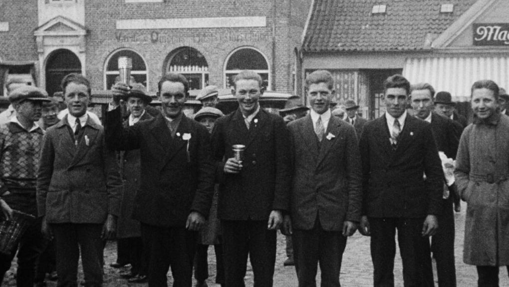 Ribe Amts Tidendes kolonnemarch i Varde søndag d. 6. marts 1932. Kolonnemarch er en sportsgren, der opstod i 1930'erne, og den vandt indpas i hele landet. Sporten er inspireret af marcher i Tyskland og kan bedst beskrives som en slags kapgang på tid. Vardemarchen er også på tid, og her deltager grupper, udklædte, mænd, kvinder og børn. Den begynder på Varde Torv og fortsætter ud på de sneglatte landeveje for så at slutte på Torvet igen.