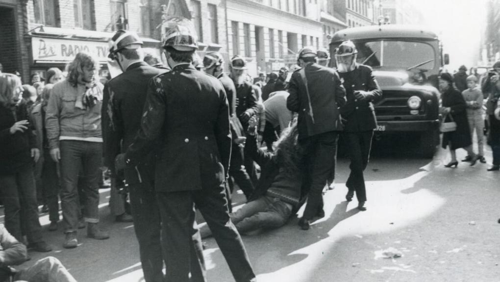 Protestsangene lyder, mens politiet stormer det besatte hus, Jægersborggade 3, den 16. marts 1971. 21 slumstormere fængsles i 14 dage som følge af aktionen.