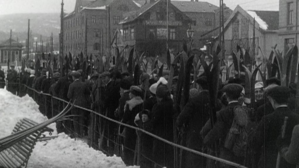En lang kø af skiløbere venter på at komme med toget på Majorstuen station, så de kan komme til Holmenkollen og stå på ski.